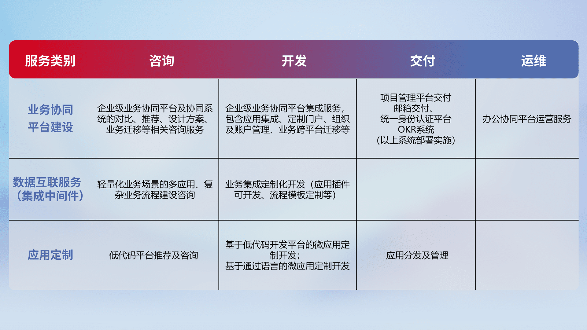 针对钉钉、、企微、、、、IDaas等平台级产品提供产品的规划、、方案、、、交付、、、定制化开发等服务,,,,实现如统一协同办公、、智能客户服务、、混合会议管理、、、、智能数据查询、、等业务场景,,,实现数字化转型。。。